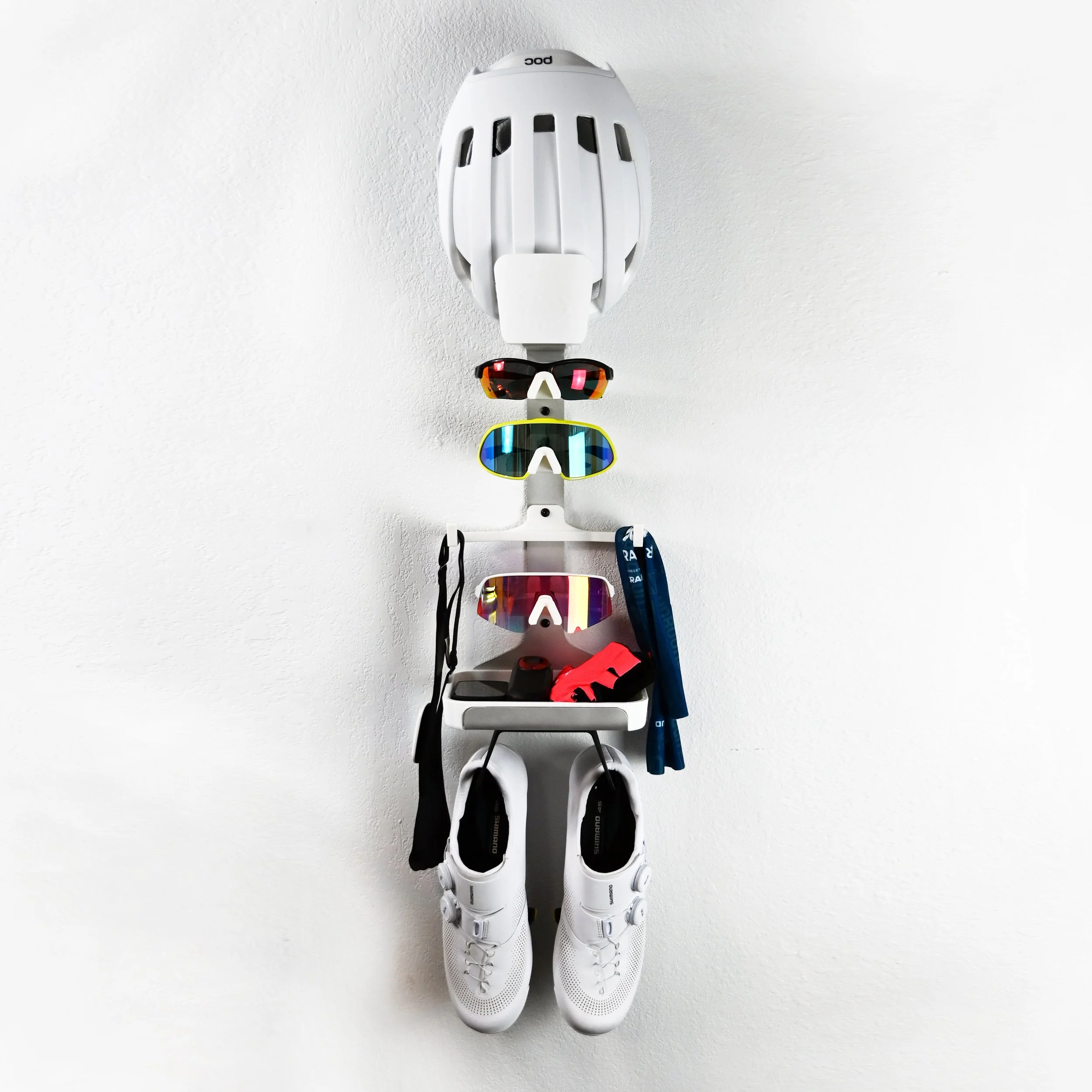 Vent Gear Storage is a compact, wall-mounted cycling gear organizer that stores your helmet, computer, tail light, sunglasses, shoes, and more all together, ready for your next ride